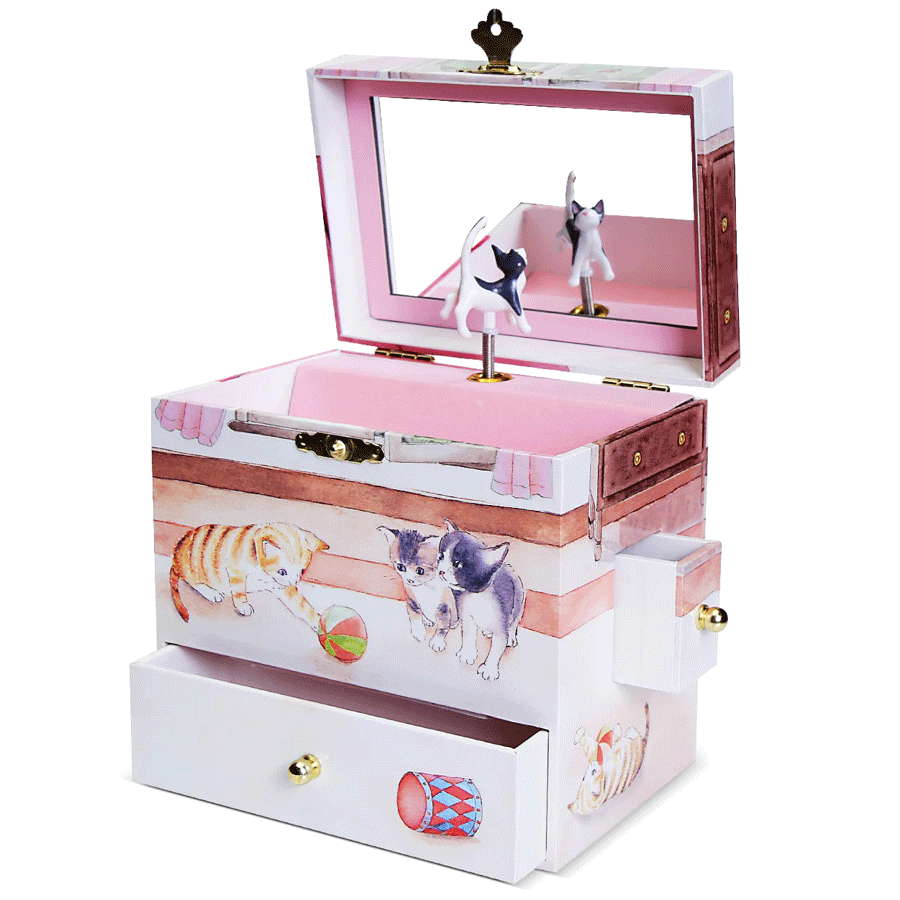 Curious Kittens Musical Jewelry Box has unique watercolor designs of playful kittens on the top and all around the sides. The Curious Kittens box has 1 big compartment, and 4 pullout drawers providing enough space to store jewelry and treasures. Children will dance along while the Kitten figurine inside rotates with the clear, bright melody that rings out. This box adds a delightful accent in a child’s room and is the perfect birthday or holiday gift for a cat lovers!