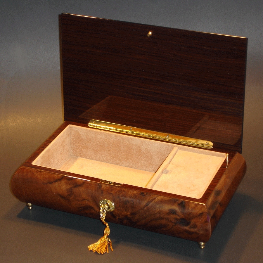 Stunning Italian Inlaid Musical Jewelry Box. This large jewelry box is hand-crafted in Walnut wood with highly detailed flowers inlaid in the lid. The smooth, high gloss finish is hand buffed. The interior is a soft tan felt with a large ring holder and lots of space for jewelry. There is a lift off cover so you can see the musical mechanism play. The box has a tasseled brass key for locking and brass hinges add to the beauty of the box. Color of the 18 note musical mechanism may vary.