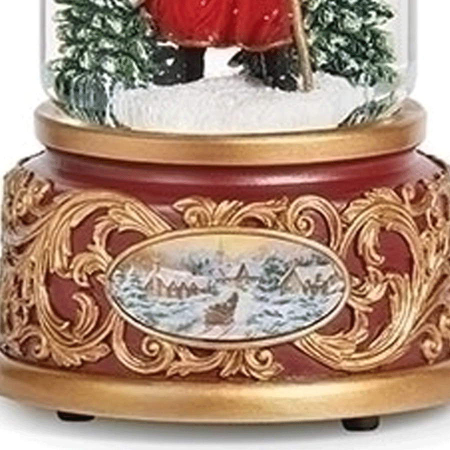 Victorian Santa Musical Snow Globe has Saint Nicholas inside the dome, walking through the snow and surrounded by pine trees. The base of this musical snow globe is absolutely beautiful, done in deep red with ornate gold filigree designs. In the center of the base is an oval scene of a classic village in the winter.